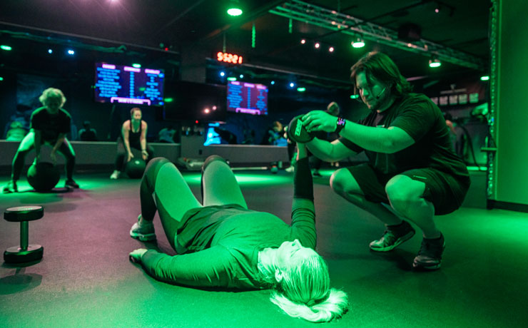Unlike traditional group fitness classes, our Small Group Personal Training sessions are intentionally capped to maintain quality coaching while creating a powerful group dynamic. The room comes alive with lights synced to the music, delivering a visually engaging, rhythm-driven workout that feels more like a live concert than a standard gym session.